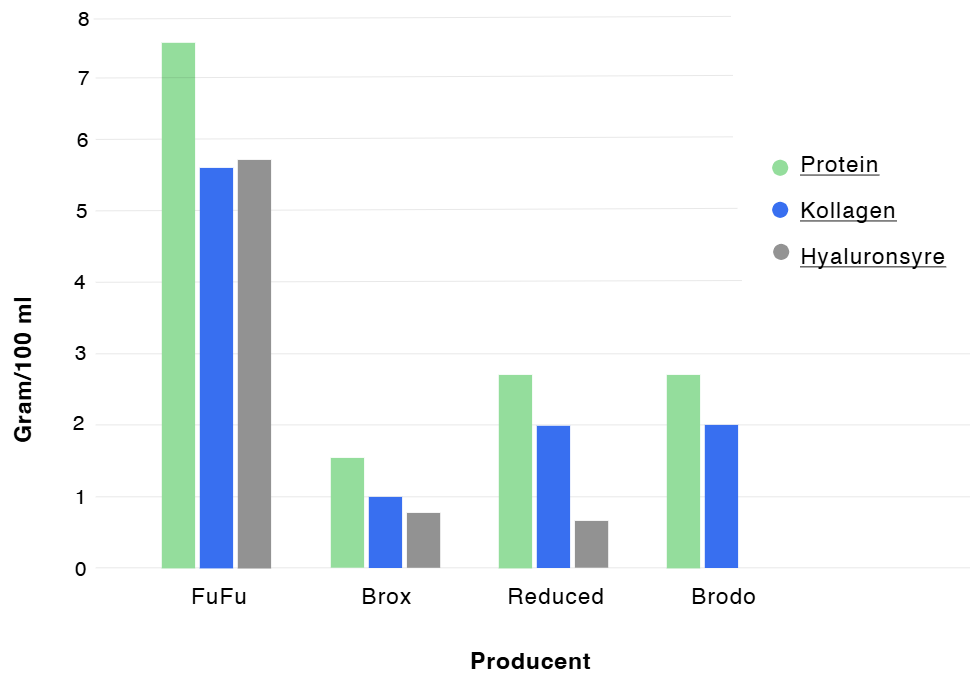 One serving (≈ 130 mL) contains 7.4 g of collagen from 9.75 g of protein. One glass contains 390 mL and is equivalent to 3 servings.